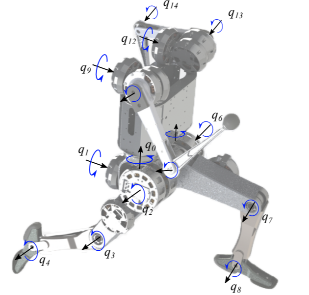 研究人员表示,该机器人的腿部有五个定制的执行器:三个位于臀部,一个位于膝盖,还有一个用于控制脚踝的转动。膝盖、脚踝和关节均有一个皮带传动系统,以在这些关节提供更高的扭矩。五个执行器使得每条腿在每只脚上产生三维地面反作用力,以及每只脚的转动和偏航轴的力矩