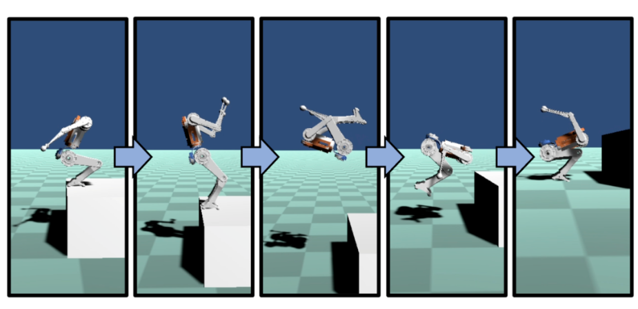 起飞阶段 ,是通过新研发的驱动感知 Kino 动态规划(AAKD)进行的。AAKD 规划的第一个步骤是运动选择,它基于对地形和任务的评估,为机器人选择必要的运动(例如跳到桌子上、做一个后空翻等)。第二步骤是基于质心动力学的轨迹优化,为机器人找到一条可行的轨迹;