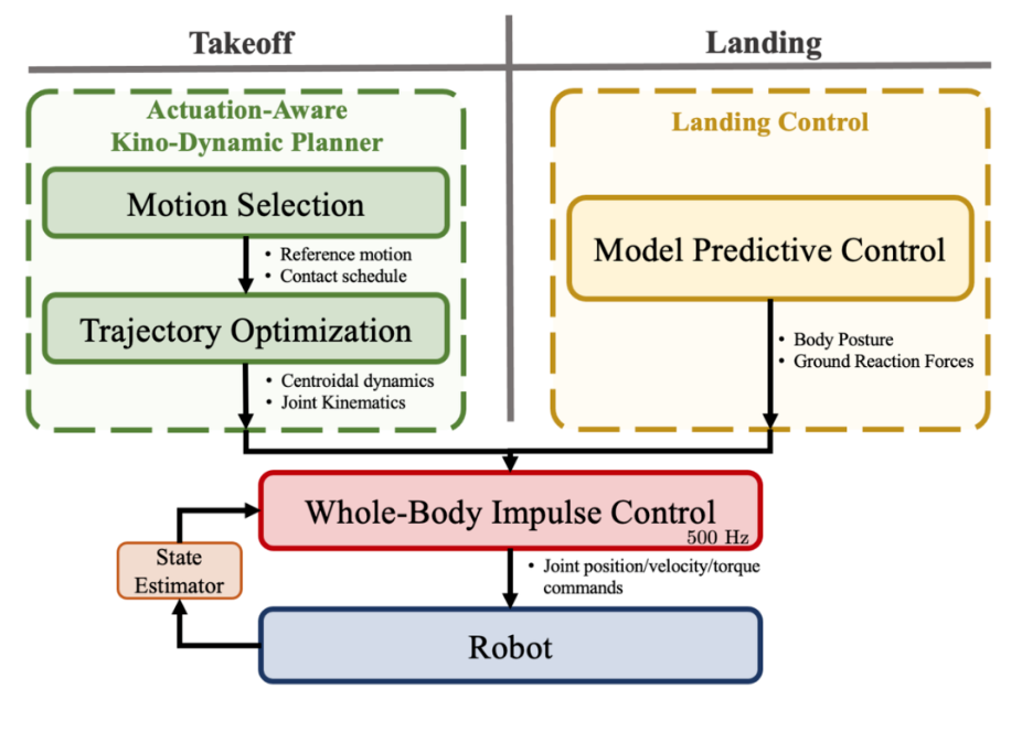 为了充分发挥机器人在脉冲运动中的动态能力,研究人员研发了一种新的 Kino 动态规划器,有效地处理了机器人的执行器极限,同时采用了分层控制框架,有效地将模型预测控制和全身控制相结合,从而实现跳跃后的稳定着陆。